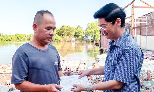 | Ông Nguyễn Văn Khởi, Phó Chủ tịch Ủy ban MTTQ Việt Nam tỉnh Cà Mau cùng đoàn công tác trao tiền hỗ trợ các hộ dân bị thiệt hại tài sản do sạt lở. |