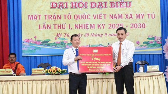 Dịp này, Ủy ban MTTQ Việt Nam TP Cần Thơ đã trao bảng tượng trưng tặng 40 suất học bổng cho học sinh nghèo, vượt khó học tốt trên địa bàn xã Mỹ Tú. Trong đó, 10 suất được trao tặng trực tiếp tại Đại hội, mỗi suất 1 triệu đồng.