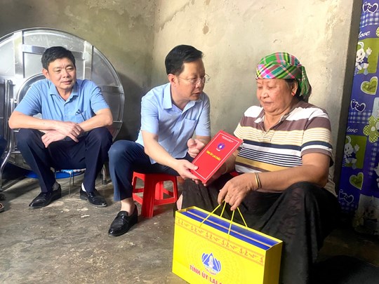 | Đồng chí Phó Bí thư Tỉnh ủy tỉnh Lai Châu cùng các đồng chí trong đoàn thăm, tặng quà bà Vàng Thị Pịch (ở bản Mấn 2) là vợ liệt sĩ Tao Văn Khạt. |