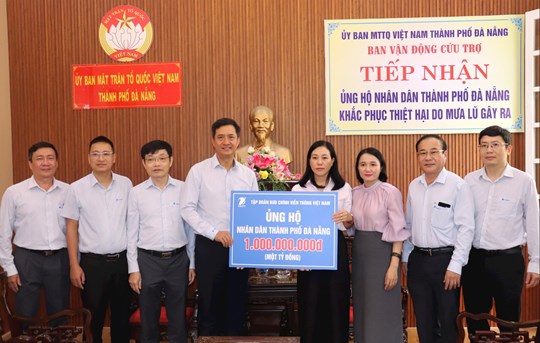 (Mặt trận) - Chiều 13/11, lãnh đạo Ủy ban MTTQ Việt Nam thành phố Đà Nẵng tiếp nhận 2 tỷ đồng từ Tập đoàn Bưu chính Viễn thông Việt Nam (VNPT), Công ty CP Đô thị FPT Đà Nẵng và Công ty CP Tập đoàn Đạt Phương trao tặng, nhằm hỗ trợ người dân khắc phục hậu quả do mưa lũ.