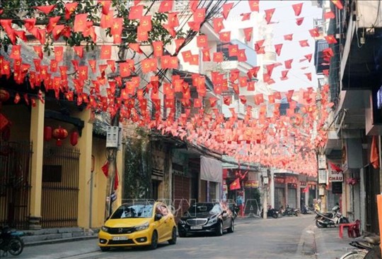 | Trên tuyến phố Hàng Sắt, phường Nam Định được người dân trang trí các dây treo cờ Tổ quốc và cờ Đảng |