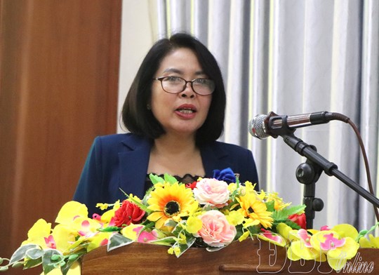 | Bà Lò Thị Minh Phượng, Ủy viên BTV Tỉnh ủy, Trưởng ban Tuyên giáo và Dân vận Tỉnh ủy phát biểu tại hội nghị |