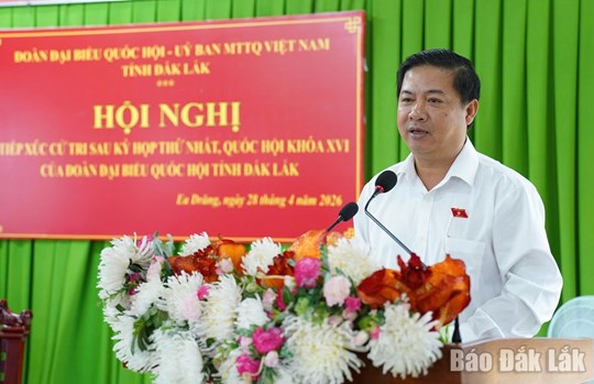 (Mặt trận) - Sáng 28/4, tại đơn vị bầu cử số 4, Đoàn đại biểu Quốc hội tỉnh Đắk Lắk phối hợp Ban Thường trực Ủy ban Mặt trận Tổ quốc Việt Nam tỉnh Đắk Lắk tổ chức Hội nghị tiếp xúc cử tri sau Kỳ họp thứ nhất, Quốc hội khóa XVI với cử tri của các xã: Ea Drăng, Ea Khăl và Ea Hiao.