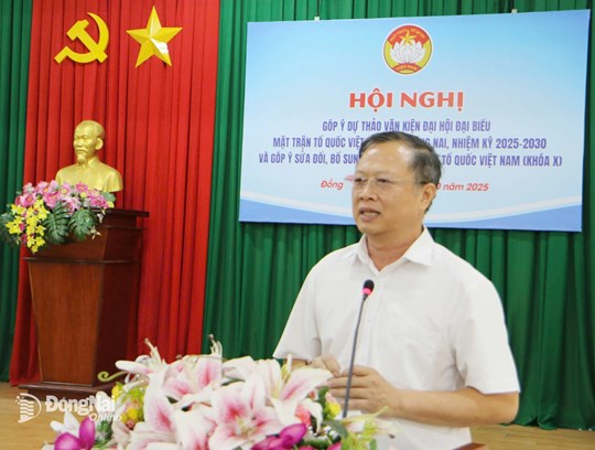 Phó Chủ tịch Ủy ban MTTQ Việt Nam tỉnh Đồng Nai Nguyễn Tấn Phú giới thiệu dự thảo văn kiện. Ảnh: Văn Truyên |