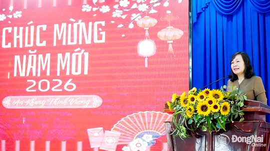 | Phó Bí thư Tỉnh ủy, Chủ tịch Ủy ban MTTQ Việt Nam tỉnh Đồng Nai Huỳnh Thị Hằng chúc Tết người dân tại chương trình. Ảnh: Văn Tâm |