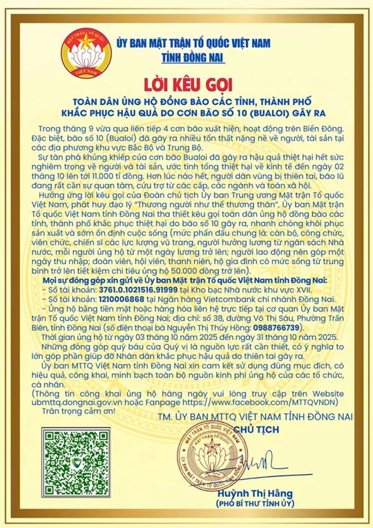 Hưởng ứng lời kêu gọi của Đoàn Chủ tịch Ủy ban Trung ương MTTQ Việt Nam, Ủy ban MTTQ Việt Nam tỉnh Đồng Nai kêu gọi các tầng lớp nhân dân, cán bộ, công chức, viên chức, lực lượng vũ trang, doanh nghiệp và các nhà hảo tâm cùng quyên góp, ủng hộ bằng tiền hoặc hiện vật để giúp người dân vùng bị thiên tai sớm khôi phục cuộc sống. Ủy ban MTTQ Việt Nam tỉnh Đồng Nai cam kết sử dụng mọi nguồn đóng góp đúng mục đích, hiệu quả, công khai và minh bạch.