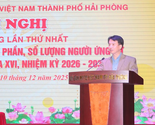 | Ông Nguyễn Đức Tuấn - Ủy viên Ban Thường vụ Thành ủy, Phó Chủ tịch Thường trực Ủy ban MTTQ Việt Nam thành phố, Phó Chủ tịch Ủy ban Bầu cử thành phố phát biểu tại hội nghị |