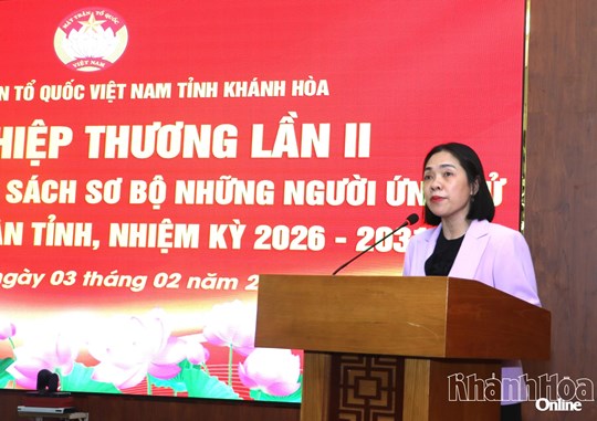 (Mặt trận) - Sáng 03/02, các đồng chí: Nguyễn Khắc Hà, Phó Bí thư Tỉnh ủy, Chủ tịch Ủy ban Mặt trận Tổ quốc Việt Nam tỉnh Khánh Hòa; Trần Thu Mai, Ủy viên Ban Thường vụ Tỉnh ủy, Phó Chủ tịch Thường trực Ủy ban Mặt trận Tổ quốc Việt Nam tỉnh Khánh Hòa chủ trì Hội nghị hiệp thương lần 2 thỏa thuận lập danh sách sơ bộ 110 người ứng cử đại biểu Hội đồng nhân dân tỉnh Khánh Hòa, nhiệm kỳ 2026 - 2031. Tham dự Hội nghị có đồng chí Lữ Thanh Hải, Ủy viên Ban Thường vụ Tỉnh ủy, Phó Chủ tịch Thường trực Hội đồng nhân dân tỉnh, Phó Chủ tịch Ủy ban Bầu cử tỉnh Khánh Hòa.