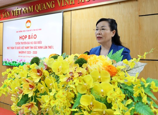 Phát biểu kết luận buổi họp báo, Chủ tịch Ủy ban Mặt trận Tổ quốc tỉnh Bắc Ninh Nguyễn Thị Hà nhấn mạnh, Đại hội đại biểu Mặt trận Tổ quốc Việt Nam tỉnh Bắc Ninh lần thứ I, nhiệm kỳ 2025-2030 là đợt sinh hoạt chính trị quan trọng và mong muốn các cơ quan thông tấn, báo chí tích cực đẩy mạnh công tác tuyên truyền, tạo sức lan tỏa sâu rộng trong các tầng lớp Nhân dân, góp phần phát huy sức mạnh đại đoàn kết toàn dân tộc, chung sức đồng lòng, thực hiện thắng lợi các chương trình hành động do Đại hội đề ra, vì mục tiêu xây dựng quê hương Bắc Ninh phát triển văn minh, hiện đại, giàu bản sắc văn hóa dân tộc.