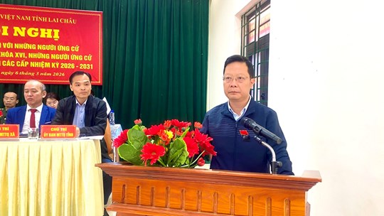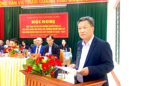 (Mặt trận) Sáng 6/3, Ban Thường trực Ủy ban Mặt trận Tổ quốc (MTTQ) Việt Nam tỉnh Lai Châu chủ trì, phối hợp với Đảng ủy, HĐND, UBND, Ủy ban Bầu cử và Ủy ban MTTQ Việt Nam xã Phong Thổ tổ chức Hội nghị tiếp xúc cử tri vận động bầu cử giữa những người ứng cử đại biểu Quốc hội khóa XVI và đại biểu HĐND các cấp nhiệm kỳ 2026 - 2031.