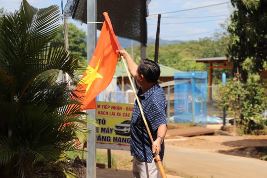 | Người dân vùng đồng bào dân tộc thiểu số treo cờ Tổ quốc dọc các tuyến đường dẫn về nơi bỏ phiếu |