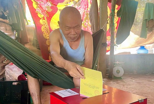 | Cử tri Trương Tấn Lĩnh bị tai biến nặng tại thôn Lò To, xã Hàm Thạnh bỏ phiếu bầu cử tại nhà |