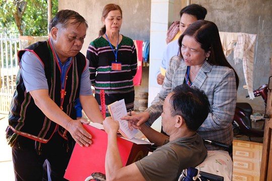 | Cử tri Doãn Thị Hưởng (70 năm tuổi Đảng) ở xã Đắk Song tiến hành bỏ phiếu tại nhà |