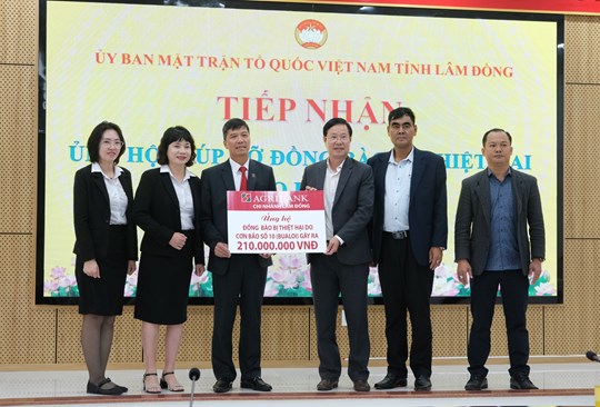 (Mặt trận) - Sáng 27/10, tại trụ sở Ủy ban MTTQ Việt Nam tỉnh Lâm Đồng, Ngân hàng Nông nghiệp và Phát triển nông thôn (Agribank) chi nhánh Lâm Đồng đã trao 210 triệu đồng ủng hộ đồng bào bị thiệt hại do cơn bão số 10 (Bualoi) và 500 triệu đồng đóng góp vào Quỹ “Vì người nghèo” của tỉnh.