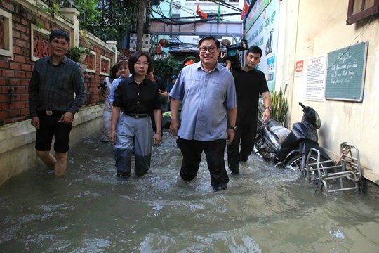 Sau khi thăm hỏi, động viên một số hộ dân, bà Bùi Huyền Mai cùng đoàn đã tới thăm hỏi, động viên tổ vận hành máy bơm tiêu nước - thiết bị có công suất lớn 5m3/s, hoạt động 24/24h vừa được thành phố hỗ trợ ngày 8-10, giúp tiêu thoát khoảng 70%- 80% lượng nước ngập trong ngày cao điểm vừa qua.