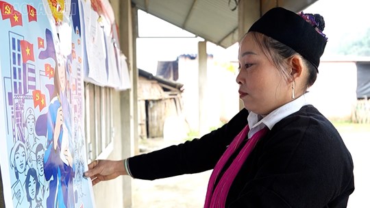 | Chị Trương Thị Nhau - Trưởng Ban Công tác Mặt trận thôn Nậm Bắt, xã Nghĩa Đô tích cực trong công tác tuyên truyền, vận động bà con theo dõi các thông tin về cuộc bầu cử. |
