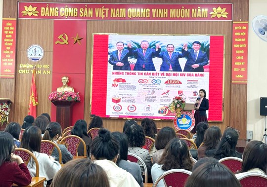 | Bí thư Chi bộ, Hiệu trưởng Trường Tiểu học Chu Văn An (phường Gia Viên) Phạm Thị Diện trao đổi, quán triệt, truyền đạt thông tin về Đại hội đại biểu toàn quốc lần thứ XIV của Đảng tới cán bộ, đảng viên, giáo viên nhà trường. Ảnh: PHONG TUYẾT. |