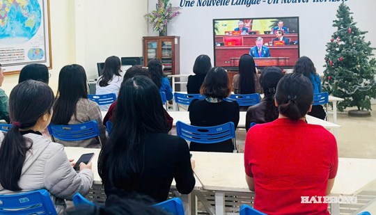 | Cán bộ, giáo viên Trường Tiểu học Đinh Tiên Hoàng (phường Hồng Bàng) theo dõi Lễ khai mạc Đại hội đại biểu toàn quốc lần thứ XIV của Đảng. |