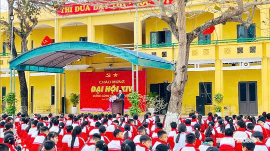 | Thầy trò Trường Tiểu học Hà Kỳ (xã Nguyên Giáp) thực hiện nghi lễ chào cờ chào mừng Đại hội đại biểu toàn quốc lần thứ XIV của Đảng. |