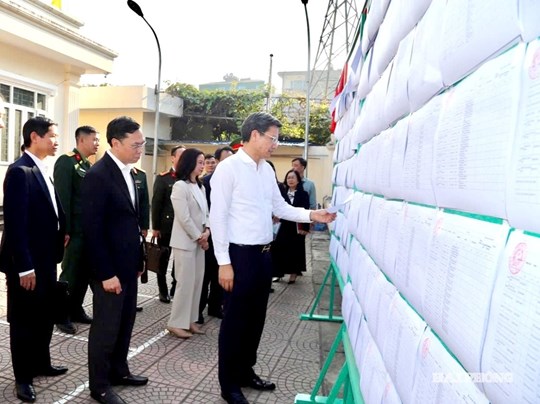 Đoàn kiểm tra công tác chuẩn bị điều kiện vật chất khu vực bầu cử; trang trí, khánh tiết, niêm yết danh sách cử tri; ứng dụng công nghệ thông tin phục vụ công tác bầu cử.