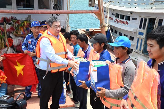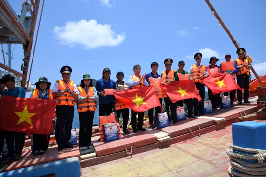 Đoàn đại biểu thành phố Hồ Chí Minh trao cờ Tổ quốc và quà động viên ngư dân vươn khơi bám biển