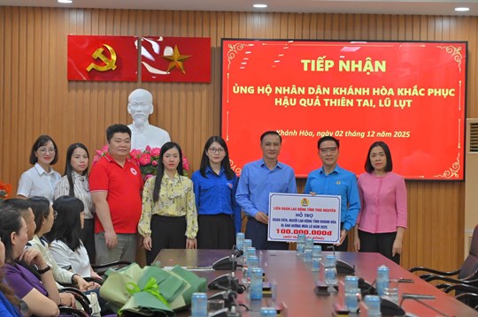| Đoàn trao số tiền 100 triệu đồng do Liên đoàn Lao động tỉnh Thái Nguyên hỗ trợ đoàn viên công đoàn, người lao động tỉnh Khánh Hoà bị ảnh hưởng do thiên tai. |