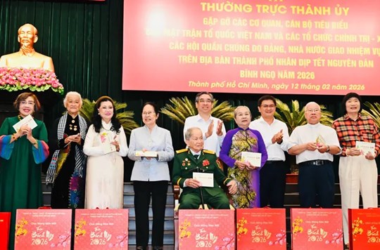 (Mặt trận) - Chiều 12/2/2026, Thường trực Thành ủy TPHCM gặp gỡ các cơ quan, cán bộ tiêu biểu của MTTQ Việt Nam và các tổ chức chính trị - xã hội, các hội quần chúng do Đảng, Nhà nước giao nhiệm vụ trên địa bàn TPHCM, nhân dịp Tết Bính Ngọ 2026.