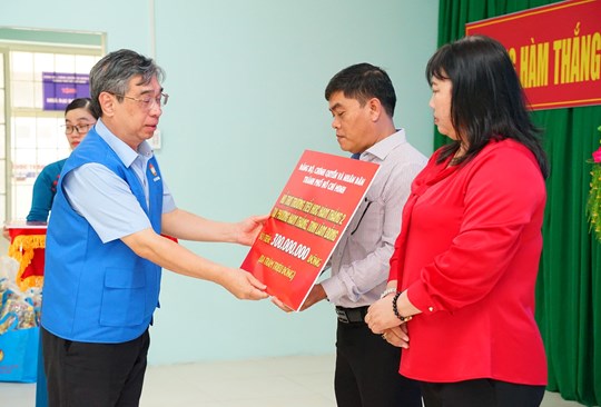 Ông Nguyễn Phước Lộc, Phó Bí thư Thành ủy, Chủ tịch Ủy ban MTTQ Việt Nam TP. Hồ Chí Minh và Bà Phạm Thị Phúc, Phó Bí thư Tỉnh ủy, Chủ tịch Ủy ban MTTQ Việt Nam tỉnh trao quà cho thầy cô giáo bị ảnh hưởng mưa lũ