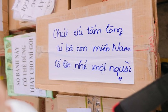 | Những lời nhắn nhủ động viên, chia sẻ của người dân miền Nam trên các thùng hàng khiến nhiều người xúc động. Ảnh: Nguyễn Tiến |