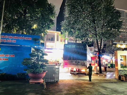 | Hơn 23 giờ cùng ngày, tại số 55 Mạc Đĩnh Chi, trụ sở UBMTTQVN TP Hồ Chí Minh, người dân vẫn miệt mài phân loại, đóng gói đồ cứu trợ để kịp đưa lên xe vận chuyển trong đêm |