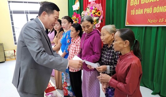 | Phó Chủ tịch HĐND thành phố Hà Văn Tuấn trao quà cho người dân tổ dân phố Đông Phú, phường Phong Dinh |