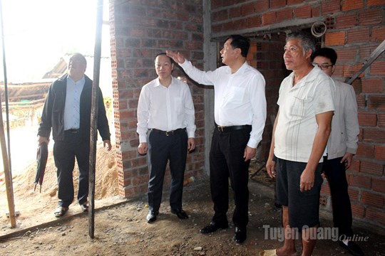 | Ông Phùng Tiến Quân đến thăm và kiểm tra tiến độ xây dựng nhà ở hộ gia đình ông Tráng Tải Nguyên, thôn Nà Sài có nhà bị sập do ảnh hưởng của cơn bão số 10. Ảnh: Nguyễn Yếm |
