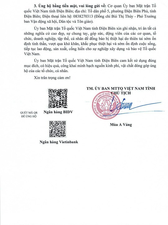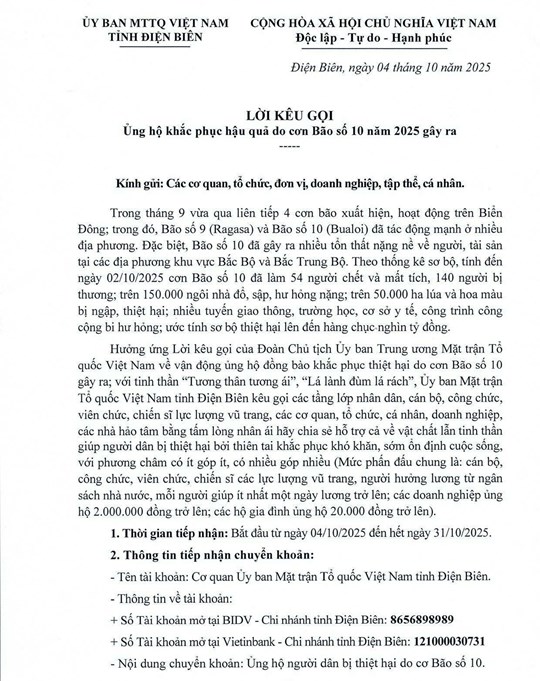 Bão số 10 vừa qua đã gây thiệt hại nặng nề tại nhiều tỉnh Bắc Bộ và Bắc Trung Bộ, làm 54 người chết và mất tích, 140 người bị thương; hơn 150.000 ngôi nhà sập, hư hỏng nặng; trên 50.000ha lúa và hoa màu bị ngập úng, ước tính thiệt hại hàng chục nghìn tỷ đồng. Ủy ban MTTQ Việt Nam tỉnh Điện Biên kêu gọi các cơ quan, tổ chức, doanh nghiệp, cá nhân, bằng tinh thần “tương thân tương ái”, chung tay ủng hộ đồng bào vùng bão lũ khắc phục khó khăn, sớm ổn định cuộc sống.