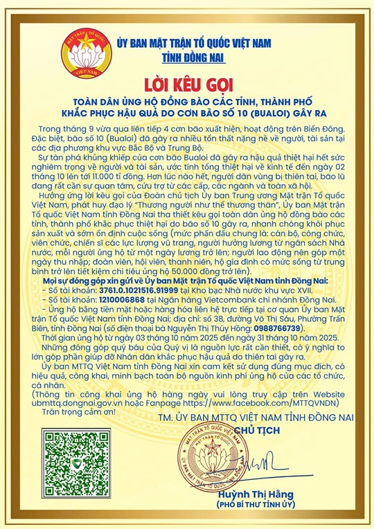 Hưởng ứng lời kêu gọi của Đoàn Chủ tịch Ủy ban Trung ương MTTQ Việt Nam, phát huy đạo lý “Thương người như thể thương thân”, Ủy ban MTTQ Việt Nam tỉnh Đồng Nai tha thiết kêu gọi toàn dân ủng hộ đồng bào các tỉnh, thành phố khắc phục thiệt hại do bão số 10 gây ra, nhanh chóng khôi phục sản xuất và sớm ổn định cuộc sống (mức phấn đấu chung là: cán bộ, công chức, viên chức, chiến sĩ các lực lượng vũ trang, người hưởng lương từ ngân sách nhà nước, mỗi người ủng hộ từ một ngày lương trở lên; người lao động nên góp một ngày thu nhập; đoàn viên, hội viên, thanh niên, hộ gia đình có mức sống từ trung bình trở lên tiết kiệm chi tiêu ủng hộ 50.000 đồng trở lên).