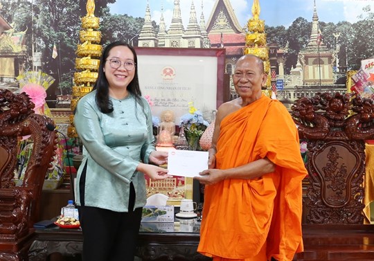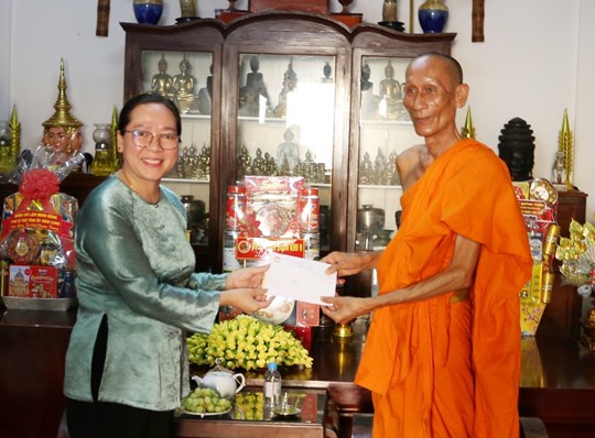 | Bà Nguyễn Thị Hồng Nhung, Ủy viên Ban Thường vụ Tỉnh ủy, Phó Chủ tịch Thường trực Ủy ban MTTQ Việt Nam tỉnh tặng quà Chôl Chnăm Thmây Hòa thượng Thạch Sok Xane |