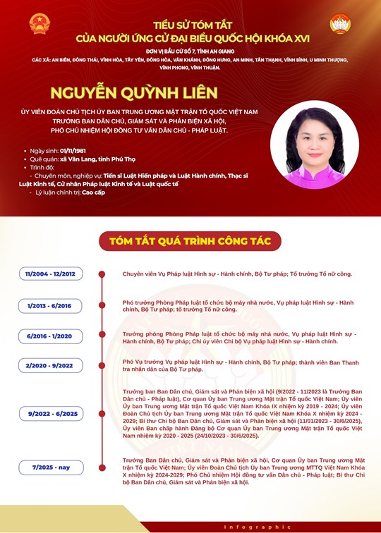 Theo Nghị quyết số 151 của Hội đồng Bầu cử Quốc gia công bố danh sách chính thức những người ứng cử đại biểu Quốc hội khóa XVI theo từng đơn vị bầu cử trong cả nước, bà Nguyễn Quỳnh Liên - Ủy viên Đoàn Chủ tịch, Trưởng ban Ban Dân chủ, Giám sát và Phản biện xã hội, Phó Chủ nhiệm Hội đồng tư vấn Dân chủ - Pháp luật cơ quan Ủy ban Trung ương MTTQ Việt Nam ứng cử Đại biểu Quốc hội tại đơn vị bầu cử số 7, tỉnh An Giang.