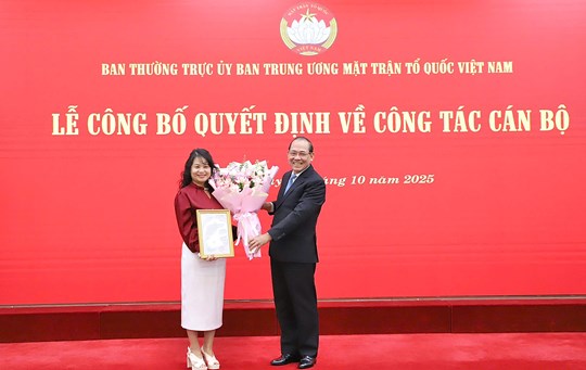 | Phó Chủ tịch Ủy ban Trung ương MTTQ Việt Nam Hoàng Công Thủy trao Quyết định và tặng hoa chúc mừng đồng chí Nguyễn Quỳnh Liên - Ủy viên Đoàn Chủ tịch, Trưởng Ban Dân chủ, Giám sát và Phản biện xã hội Cơ quan Ủy ban Trung ương MTTQ Việt Nam |