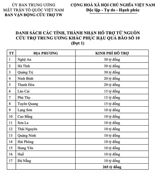 Ngay tại Lễ phát động, Ban Vận động cứu trợ Trung ương đã công bố danh sách 17 tỉnh, thành phố nhận hỗ trợ đợt 1 từ nguồn cứu trợ Trung ương khắc phục hậu quả cơn bão số 10 với tổng số tiền là 265 tỷ đồng.
