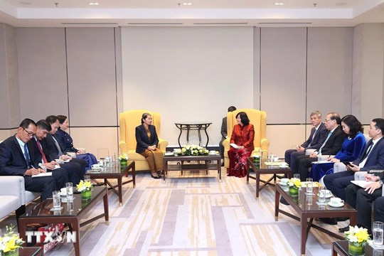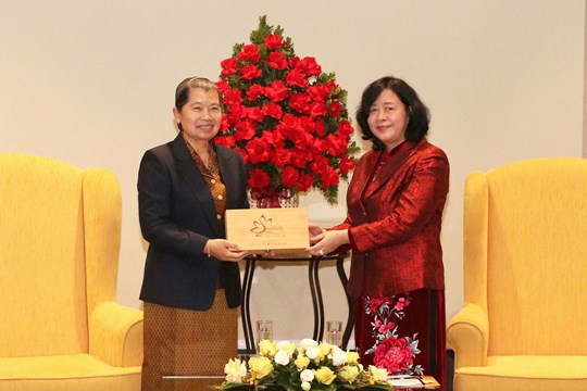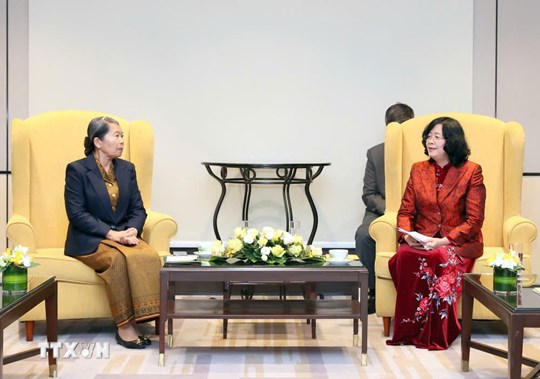 Ủy viên Bộ Chính trị, Chủ tịch Ủy ban Trung ương MTTQ Việt Nam Bùi Thị Minh Hoài và Samdech Men Sam An, Phó Chủ tịch Đảng Nhân dân Campuchia, Chủ tịch Hội đồng quốc gia Mặt trận Đoàn kết và Phát triển Tổ quốc Campuchia tại buổi tiếp. Ảnh: TTXVN