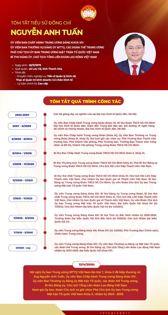 Ông Nguyễn Anh Tuấn, Ủy viên Trung ương Đảng, Ủy viên Ban Thường vụ Đảng ủy MTTQ, các đoàn thể Trung ương; Phó Chủ tịch Ủy ban Trung ương MTTQ Việt Nam; Bí thư Đảng ủy, Chủ tịch Tổng Liên đoàn Lao động Việt Nam