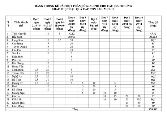 Từ số tiền tiếp nhận được, Ban Vận động Cứu trợ Trung ương đã phân bổ 10 đợt với kinh phí là 833,152 tỷ đồng qua các tài khoản của Ban cứu trợ hoặc Ủy ban Mặt trận Tổ quốc của 23 tỉnh, thành phố, trong đó, phân bổ kinh phí là 828,382 tỷ đồng; phân bổ các sản phẩm hỗ trợ là 4,77 tỷ đồng.