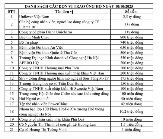 Trong ngày 10/10, Uỷ ban Trung ương MTTQ Việt Nam đã tiếp nhận ủng hộ từ hơn 20 cơ quan, tập thể, các nhân: Unilever Việt Nam số tiền 2,5 tỷ đồng; Cán bộ công nhân viên, người lao động công ty CP Lilama 10 số tiền 1 tỷ đồng; Công ty cổ phần Diana Unicharm số tiền 1 tỷ đồng; Bảo tín Minh Châu số tiền 800 triệu đồng; Bệnh viện Đa khoa An Việt số tiền 650 triệu đồng; Bệnh viện Đa khoa quốc tế Thu Cúc số tiền 500 triệu đồng; Trường Đại học kinh doanh và Công nghệ Hà Nội số tiền 350 triệu đồng; APERO HQ số tiền 200 triệu đồng; Công ty TNHH Thương mại Phú Tiến số tiền 200 triệu đồng; Công ty TNHH Thương mại xuất nhập khẩu Việt Hàn số tiền 200 triệu đồng; Trường Trung học cơ sở Trần Duy Hưng số tiền 150 triệu đồng; Công ty TNHH Xuất nhập khẩu Hi Sweetie Việt Nam số tiền 100 triệu đồng; Trung ương Hội Giáo dục Chăm sóc sức khoẻ cộng đồng Việt Nam số tiền 100 triệu đồng; Hội Người cao tuổi số tiền 50 triệu đồng; Tập thể nhân viên PowerChina số tiền 42 triệu đồng; Nhóm bạn lớp 10B khoá 1961-1974 trường Phổ thông công nghiệp Hà Nội số tiền 10,2 triệu đồng; Công ty cổ phần xuất nhập khẩu Phú Quý số tiền 10 triệu đồng; Cô Nguyễn Thị Thanh và chị Lê Hương Lan số tiền 1,5 triệu đồng; cụ bà Hoàng Thị Tường Vinh số tiền 1 triệu đồng.