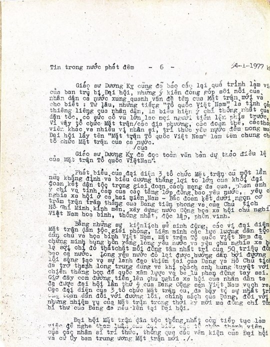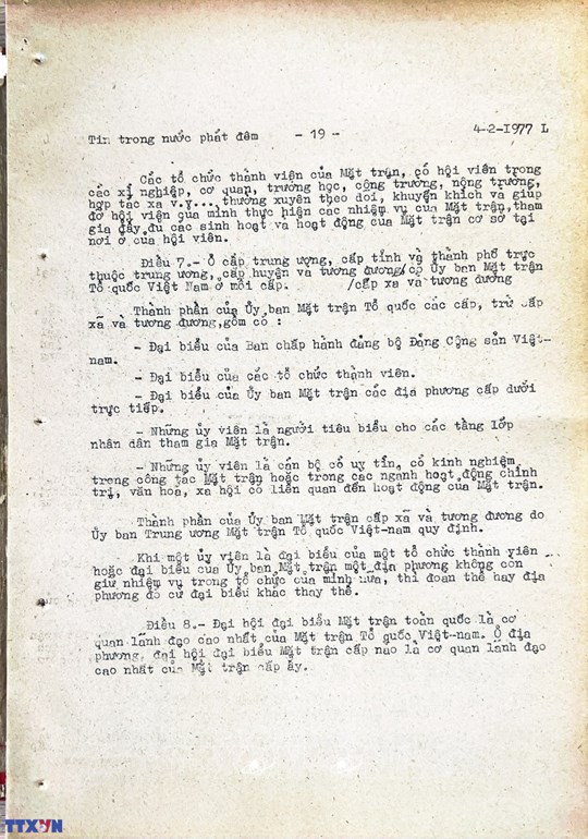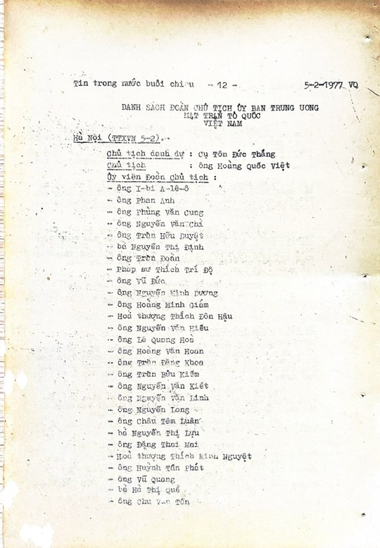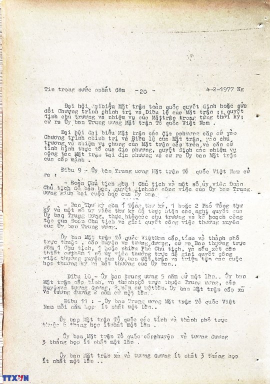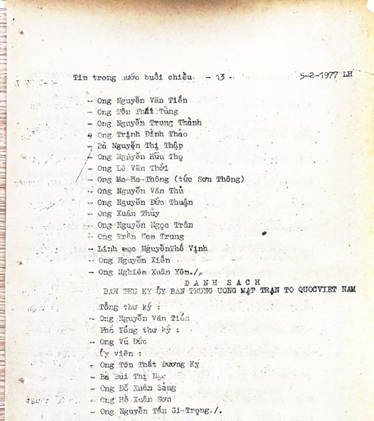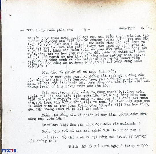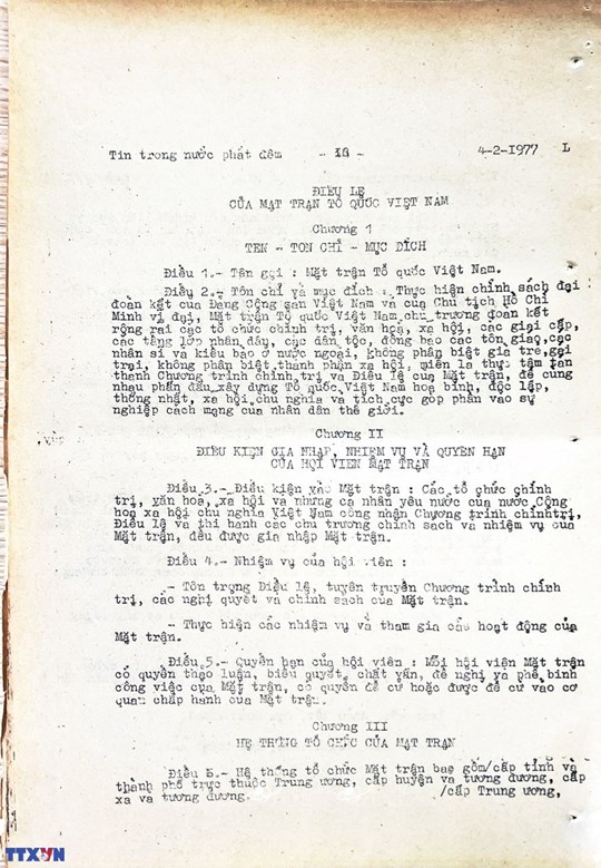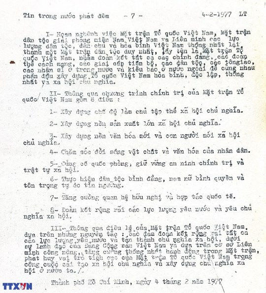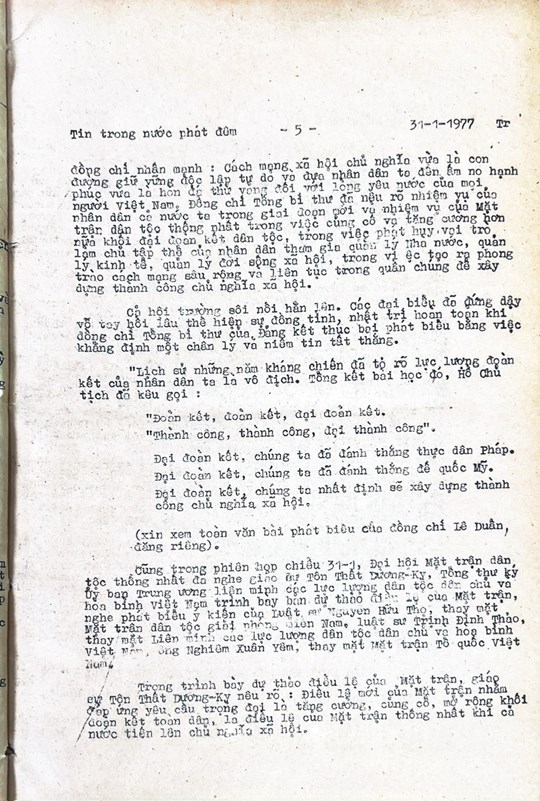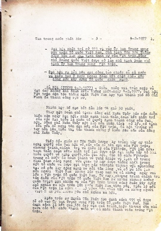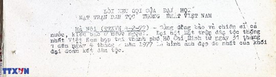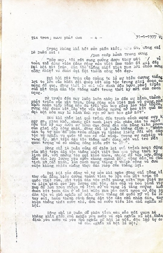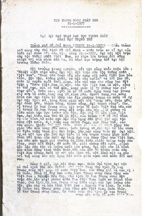 * Bài viết của Thông tấn xã Việt Nam (số 031-TTX), ngày 31/01/1977 về phiên khai mạc trọng thể Đại hội MTTQ Việt Nam lần thứ nhất