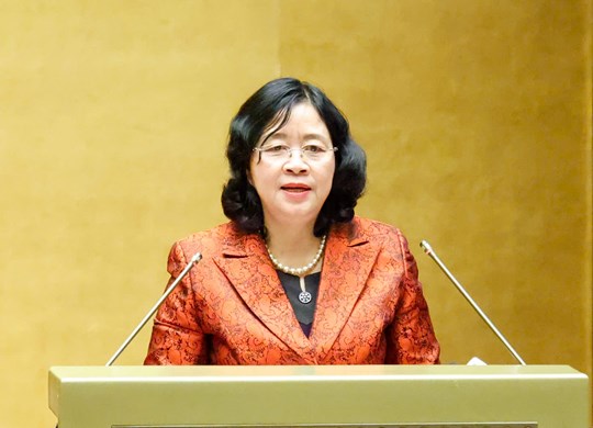 | Bà Bùi Thị Minh Hoài, Ủy viên Bộ Chính trị, Bí thư Trung ương Đảng, Bí thư Đảng ủy MTTQ, các đoàn thể Trung ương, Chủ tịch Ủy ban Trung ương MTTQ Việt Nam trình bày chuyên đề tại Hội nghị |