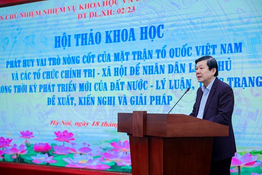 (Mặt trận) - Chiều 18/12, tại Hà Nội, Ban Chủ nhiệm nhiệm vụ khoa học và công nghệ cấp quốc gia - ĐTĐL.XH: 02/23 đã tổ chức Hội thảo khoa học "Phát huy vai trò nòng cốt của MTTQ Việt Nam và các tổ chức chính trị - xã hội để nhân dân làm chủ trong thời kỳ phát triển mới của đất nước - Lý luận, thực trạng, đề xuất, kiến nghị và giải pháp".