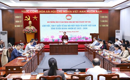 (Mặt trận) - Ngày 24/10, tại Hà Nội, bà Hà Thị Nga, Ủy viên Trung ương Đảng, Phó Chủ tịch Ủy ban Trung ương MTTQ Việt Nam đã chủ trì cuộc làm việc, cho ý kiến về Đại hội đại biểu MTTQ Việt Nam tỉnh Tuyên Quang khóa I, nhiệm kỳ 2025-2030.