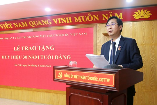 (Mặt trận) - Chiều 30/3, Đảng ủy Cơ quan Ủy ban Trung ương MTTQ Việt Nam tổ chức Lễ trao tặng Huy hiệu 30 năm tuổi Đảng và Hội nghị sơ kết công tác Đảng Quý I năm 2026.