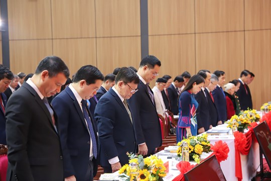 Các đại biểu dành phút mặc niệm tưởng nhớ các nạn nhân bị thiệt hại do thiên tai. Ảnh: NGỌC PHÚ