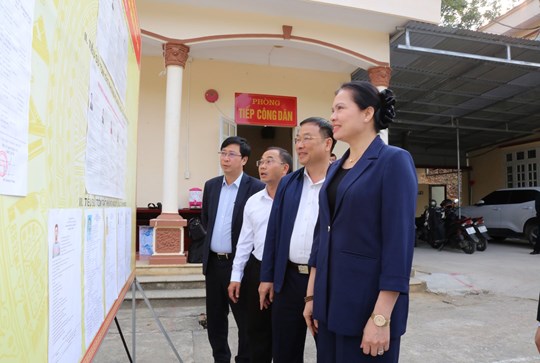 | Phó Chủ tịch - Tổng Thư ký Ủy ban Trung ương MTTQ Việt Nam Hà Thị Nga kiểm tra danh sách niêm yết của các đại biểu ứng cử Quốc hội khóa XVI và HĐND các cấp, nhiệm kỳ 2026 – 2031 tại xã Khoen On. |