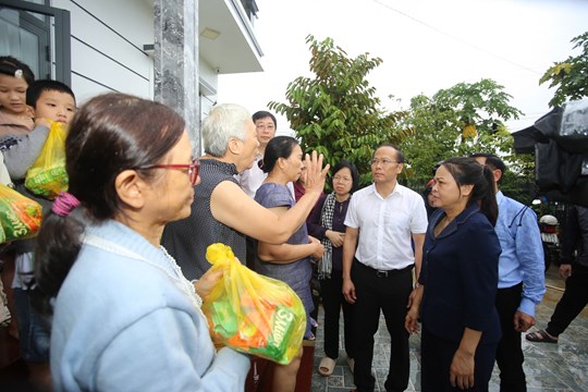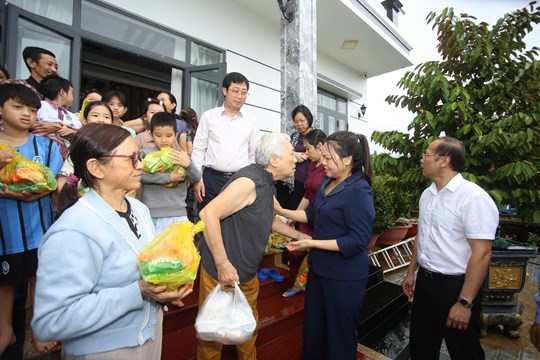 | Phó Chủ tịch - Tổng Thư ký Nguyễn Thị Thu Hà tặng quà cho các hộ dân bị ngập lụt xã Diên Thọ |